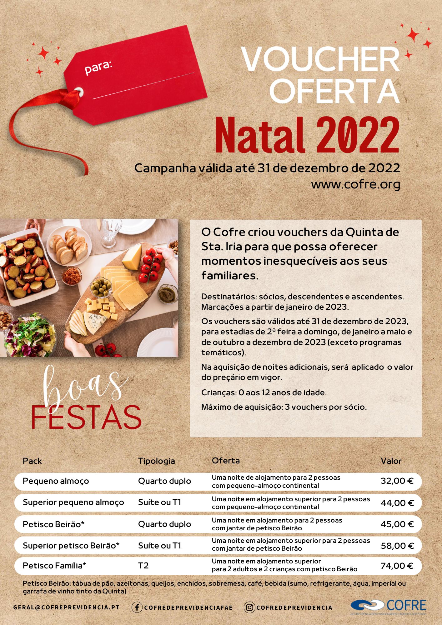 - As marcações de estadia são feitas a partir de janeiro de 2023, através do número 213 241 060, geral@cofreprevidencia.pt ou presencialmente no Cofre. Deve mencionar que tem o voucher oferta – Natal 2022